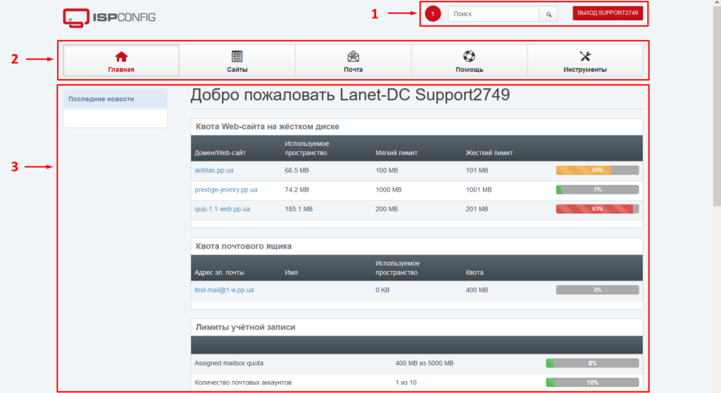 – Головна вкладка. За замовчуванням при вході в аккаунт відображається першою. Містить інформацію по всіх сайтах, базах даних та поштових скриньках даного хостинг-аккаунту. Відповідно до них показує інформація по використаному об’єму та встановлених квотах. Використовується для швидкого моніторинга статусу послуг;