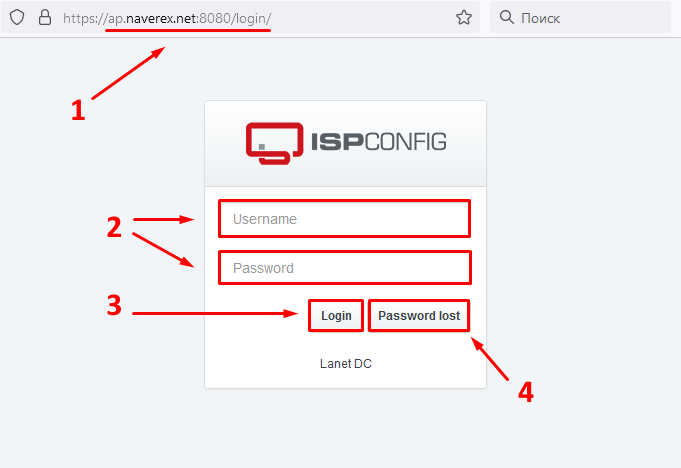 Знайомство з інтерфейсом починається з переходом на сторінку входу до хостинг-панелі (1). Після заповнення полів логіну та паролю (2) натискається кнопка входу “Login” (3). У разі проблем зі входом можно скористатись процедурою відновлення паролю через кнопку “Password lost” (4), або звернутись до технічної підтримки.