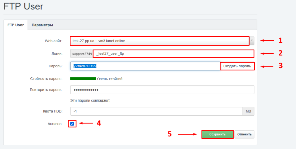 У відкритому вікні обираємо web-сайт (1) до котрого буде організовано доступ створюваного користувача. Вписуємо ім’я FTP користувача (2), де на початку рекомендуємо ставити символ “_”. Щоб вийшло, наприклад “c17_логін”. Після чого генеруємо пароль (3) та натискаємо кнопку «Зберегти» (5), попередньо переконавшись що обрана опція «Активно» (4).