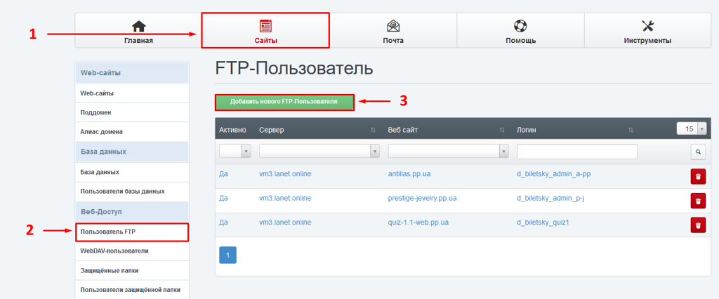 Для цього у розділі «Сайти» (1), потрібно обрати підрозділ «Користувач FTP» (2) та натиснути кнопку «Додати нового FTP користувача» (3).